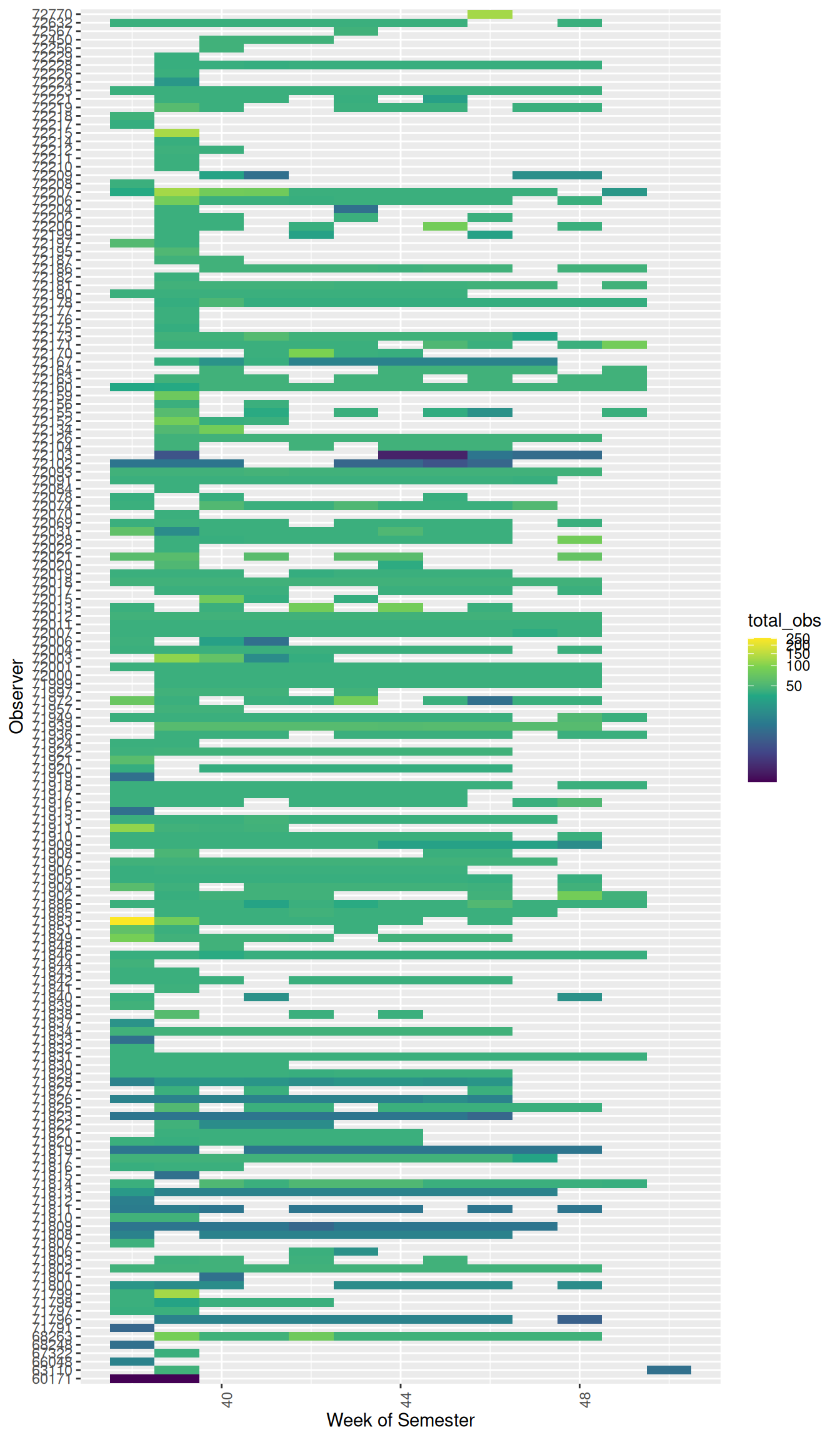 The figure below visualizes the number of observations made by each observer during each week of the semester.