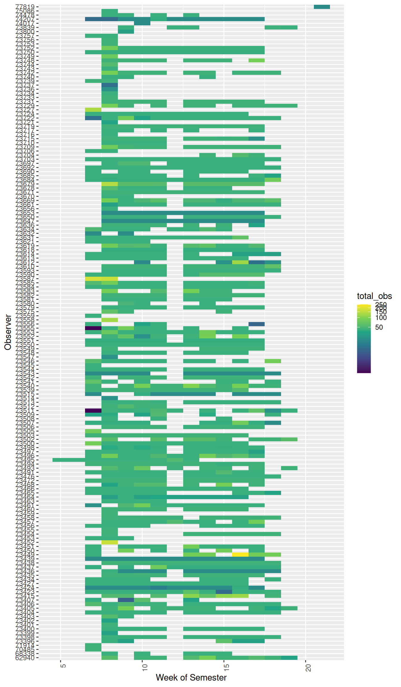 The figure below visualizes the number of observations made by each observer during each week of the semester.